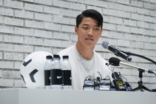 황희찬(26·울버햄턴)은 잉글랜드 프리미어리그(EPL)로 옮겨 성공적인 첫 시즌을 보낸 뒤 24일 귀국했다. 이날 정오 무렵 귀국한 그는 서울 강남구 ‘Circle81’에서 열린 기자간담회에서 “한 시즌 동안 많은 기대와 관심을 보내주신 덕분에 잘 마무리하고 돌아왔다. 축하받는 기분이 들어서 정말 감사하다”고 소감을 밝혔다.