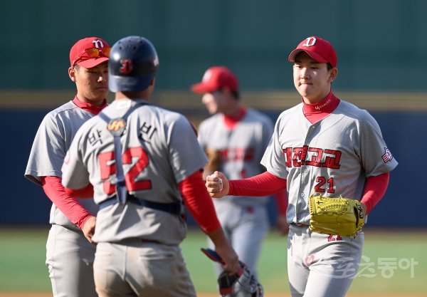 24일 서울 목동야구장에서 열린 ‘제76회 황금사자기 전국고교야구대회 겸 주말리그 왕중왕전’ 대전고와 설악고 16강전 경기에서 대전고가 10-3 7회 콜드승을 거뒀다. 대전고 송영진이 하이파이브 하고 있다.