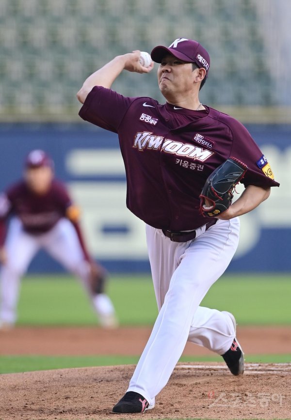 24일 서울 잠실야구장에서 열린 ‘2022 신한은행 SOL KBO리그’ LG 트윈스와 키움 히어로즈의 경기에서 선발 투수로 마운드에 오른 키움 정찬헌이 역투하고 있다.