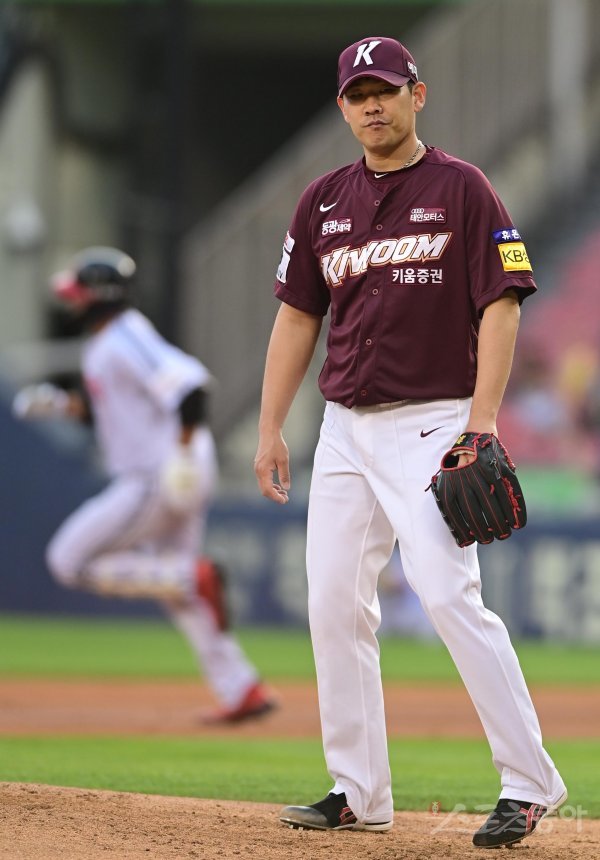24일 서울 잠실야구장에서 열린 ‘2022 신한은행 SOL KBO리그’ LG 트윈스와 키움 히어로즈의 경기에서 3회말 무사 LG에 솔로 홈런을 허용한 키움 정찬헌이 아쉬워하고 있다.