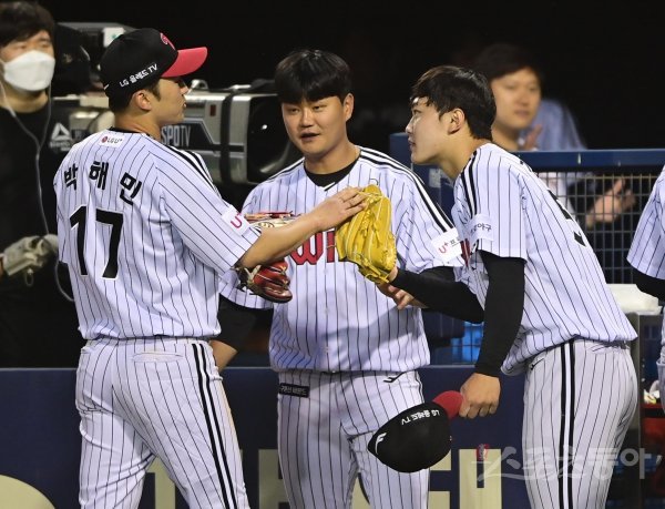 24일 서울 잠실야구장에서 열린 ‘2022 신한은행 SOL KBO리그’ LG 트윈스와 키움 히어로즈의 경기에서 5회초 수비를 마친 LG 김윤식이 박해민과 기쁨을 나누고 있다.