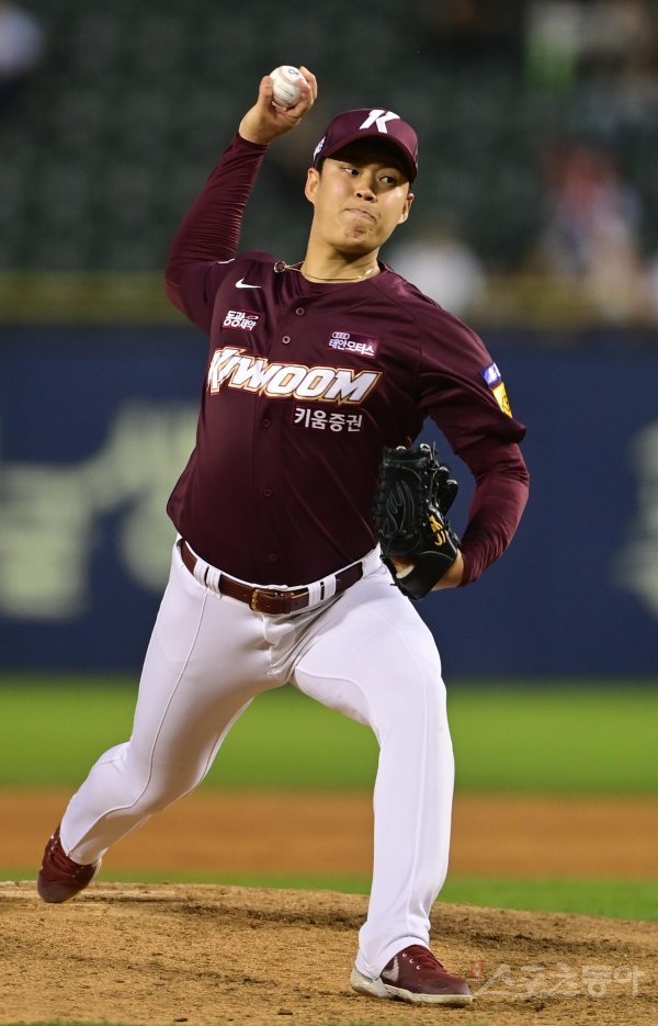 24일 서울 잠실야구장에서 열린 ‘2022 신한은행 SOL KBO리그’ LG 트윈스와 키움 히어로즈의 경기에서 5회말 키움 김선기가 교체로 마운드에 올라 역투하고 있다.