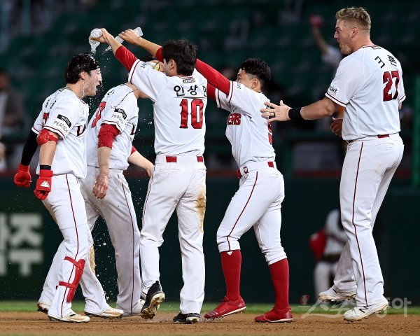 24일 인천 SSG 랜더스필드에서 ‘2022 신한은행 SOL KBO리그’ SSG 랜더스와 롯데 자이언츠의 경기가 열렸다. 9회말 1사 만루에서 SSG 최지훈이 끝내기 몸에 맞는 볼로 출루한 후 동료들의 물세례를 받고 있다.