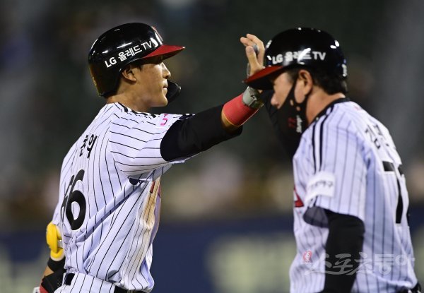 24일 서울 잠실야구장에서 열린 ‘2022 신한은행 SOL KBO리그’ LG 트윈스와 키움 히어로즈의 경기에서 9회말 무사 LG 송찬의가 좌월 솔로 홈런을 쳐낸 뒤 3루코치와 기쁨을 나누고 있다.