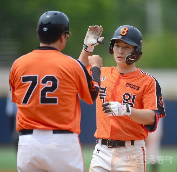 25일 서울 목동야구장에서 열린 ‘제76회 황금사자기 전국고교야구대회 겸 주말리그 왕중왕전’ 북일고와 인천고 16강전 경기 8회초 2사 1,3루 북일고 홍준서가 1타점 적시타를 치고 1루에서 기뻐하고 있다.