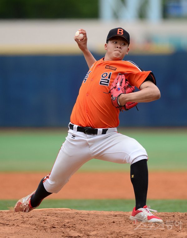 25일 서울 목동야구장에서 열린 ‘제76회 황금사자기 전국고교야구대회 겸 주말리그 왕중왕전’ 북일고와 인천고 16강전 경기에서 북일고 김휘건이 역투하고 있다.