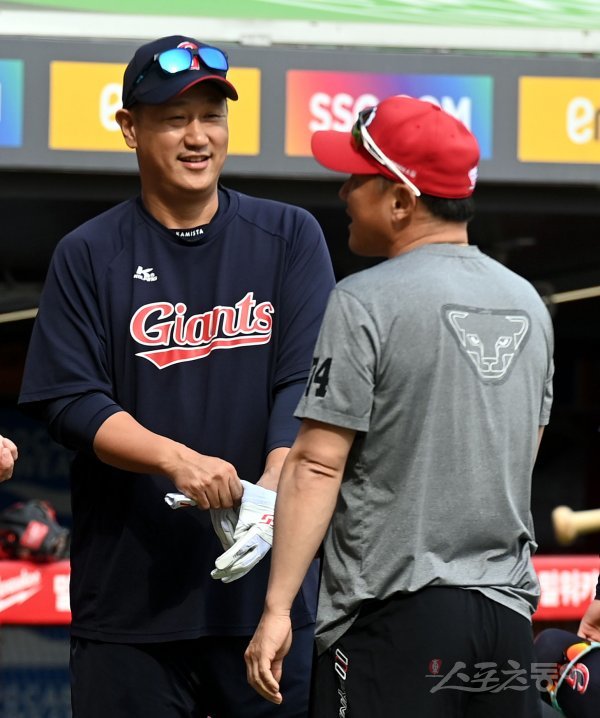 25일 인천 SSG 랜더스필드에서 ‘2022 신한은행 SOL KBO리그’ SSG 랜더스와 롯데 자이언츠의 경기가 열린다. 경기 전 롯데 이대호가 SSG 조원우 코치와 이야기를 나누고 있다.