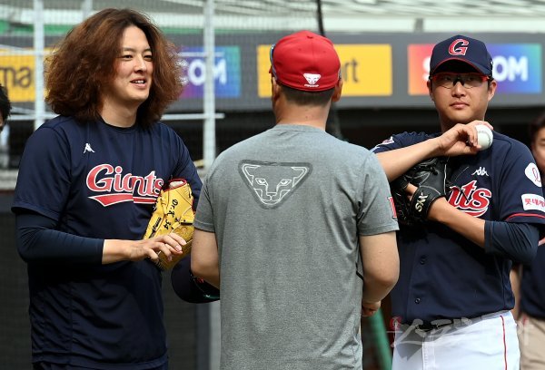 25일 인천 SSG 랜더스필드에서 ‘2022 신한은행 SOL KBO리그’ SSG 랜더스와 롯데 자이언츠의 경기가 열린다. 경기 전 롯데 김원중이 머리를 길게 기르며 이야기를 나누고 있다.