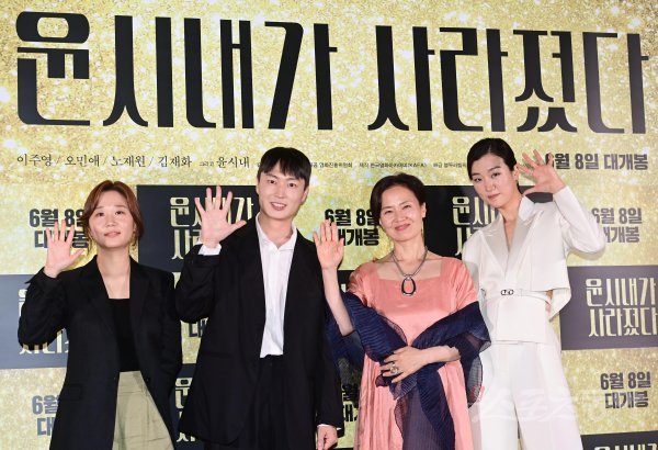 김진화 감독, 배우 노재원, 오민애, 이주영이 25일 서울 광진구 자양동 롯데시네마 건대입구점에서 열린 영화 ‘윤시내가 사라졌다’ 언론시사회에서 포즈를 취하고 있다.