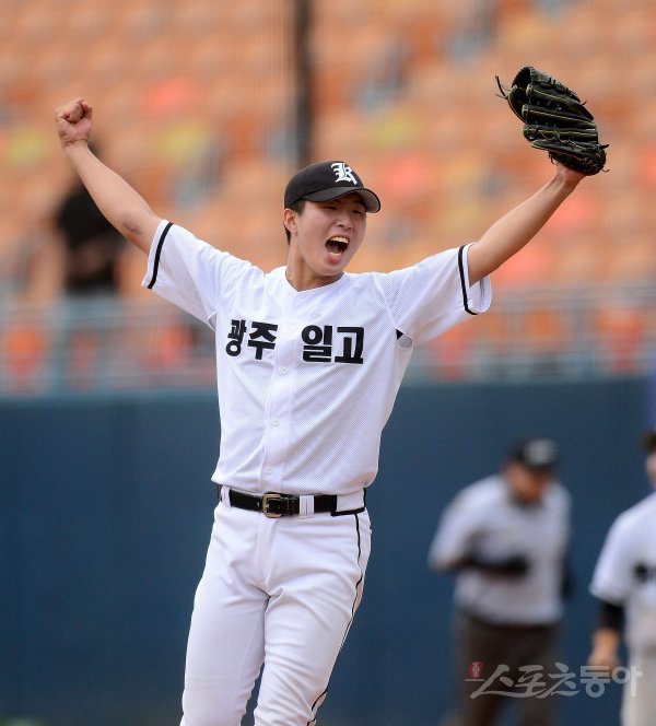 25일 서울 목동야구장에서 열린 ‘제76회 황금사자기 전국고교야구대회 겸 주말리그 왕중왕전’ 라온고와 광주제일고의 16강전 경기에서 광주제일고 이준혁이 9회초 2사 3루 라온고 타자를 삼진 아웃시킨 후 환호하고 있다.