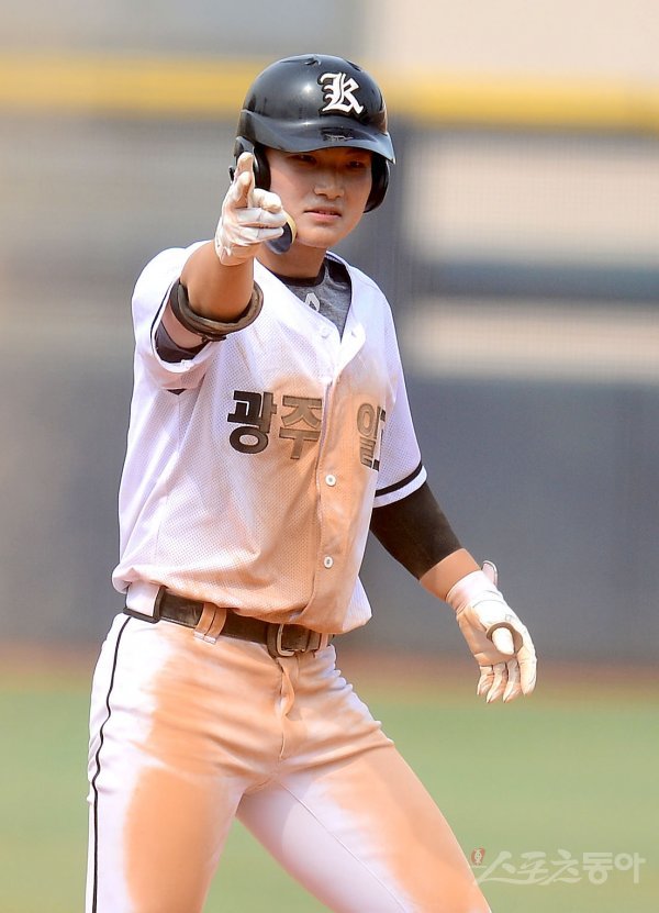25일 서울 목동야구장에서 열린 ‘제76회 황금사자기 전국고교야구대회 겸 주말리그 왕중왕전’ 라온고와 광주제일고의 16강전 경기 3회말 2사 만루 광주제일고 류승민 2타점 적시타를 1루에서 볼 빠지는 사이 2루까지 출루한 후 기뻐하고 있다.