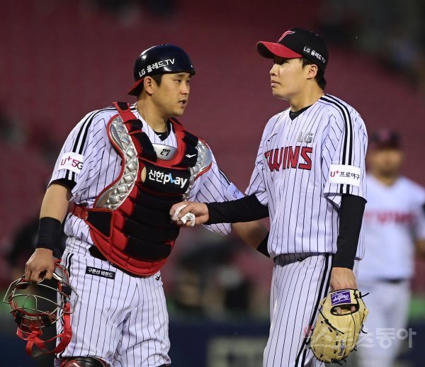 25일 서울 잠실야구장에서 열린 ‘2022 신한은행 SOL KBO리그’ LG 트윈스와 키움 히어로즈의 경기에서 4회초 1사 1루 LG 임찬규가 마운드를 내려오며 유강남의 격려를 받고 있다.