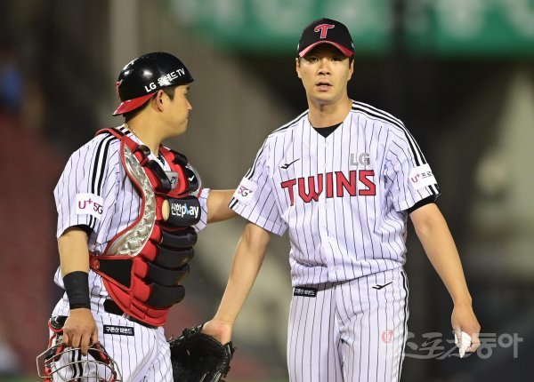 25일 서울 잠실야구장에서 열린 ‘2022 신한은행 SOL KBO리그’ LG 트윈스와 키움 히어로즈의 경기에서 5회말 1사 1루 상황에서 LG 김대유가 마운드를 내려가고 있다.