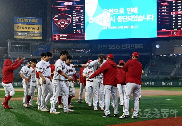 25일 인천 SSG 랜더스필드에서 ‘2022 신한은행 SOL KBO리그’ SSG 랜더스와 롯데 자이언츠의 경기가 열렸다. 7회말 우천 중단 후 SSG가 롯데에 9-1 강우 콜드 게임승을 거둔 후 선수들이 기쁨을 나누고 있다. 인천 | 김민성 기자 marineboy@donga.com