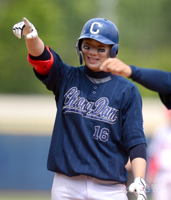 26일 서울 목동야구장에서 열린 ‘제76회 황금사자기 전국고교야구대회 겸 주말리그 왕중왕전’ 청담고와 대전고의 8강전 경기 4회초 1사 1,2루 청담고 최원준이 선제 1타점 적시타를 치고 1루에서 기뻐하고 있다.
