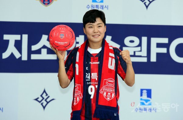 영국에서 돌아온 여자축구스타 지소연이 26일 경기도 수원시청에서 열린 ‘수원 FC 위민 입단식’에 참석해 유니폼을 입고 포즈를 취하고 있다.