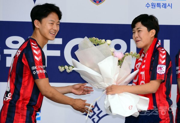 영국에서 돌아온 여자축구스타 지소연이 26일 경기도 수원시청에서 열린 ‘수원 FC 위민 입단식’에 참석해 수원 FC 이승우로부터 축하 꽃다발을 받고 있다.