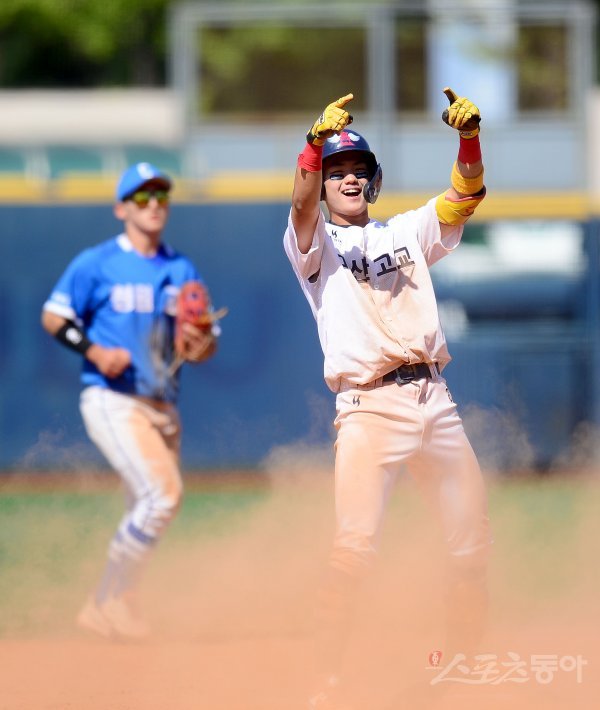 26일 서울 목동야구장에서 열린 ‘제76회 황금사자기 전국고교야구대회 겸 주말리그 왕중왕전’ 청원고와 마산고의 8강전 경기 8회말 1사 3루 마산고 신성호가 1타점 중전 2루타를 치고 2루에서 환호하고 있다.