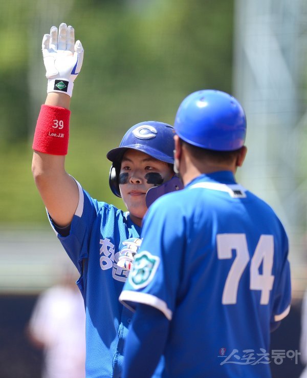 26일 서울 목동야구장에서 열린 ‘제76회 황금사자기 전국고교야구대회 겸 주말리그 왕중왕전’ 청원고와 마산고의 8강전 경기 4회초 무사 청원고 김현영이 중전 안타를 치고 1루에서 기뻐하고 있다.