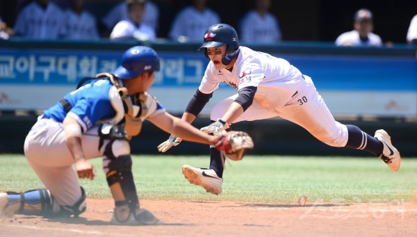 26일 서울 목동야구장에서 열린 ‘제76회 황금사자기 전국고교야구대회 겸 주말리그 왕중왕전’ 청원고와 마산고의 8강전 경기 2회말 2사 1루 마산고 안타 때 1루주자 신민우가 홈까지 달렸으나 아웃되고 있다.
