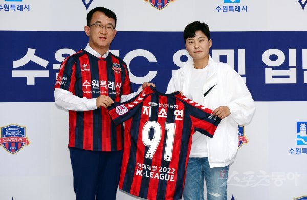 지소연이 수원FC 위민 유니폼을 착용하자 수원FC 소속 박주호와 이승우도 머플러와 꽃다발을 건네며 축하해줬다. 박주호는 “입단식 분위기를 보니 대단한 선수가 왔다는 걸 실감하고 있다. 이벤트 경기 때 발을 맞춰봤는데 우리와 함께 뛰어도 될 정도”라고 말했다.