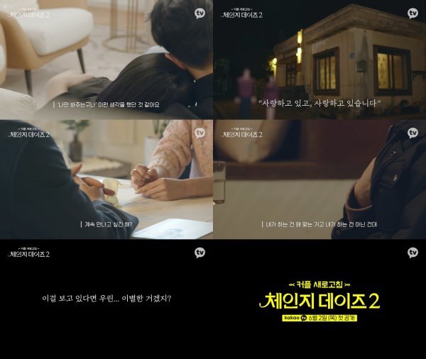오는 6월 2일(목) 오후 7시 첫 공개되는 카카오TV 오리지널 ‘체인지 데이즈’ 시즌2(연출 이재석)는 나이와 직업, 연애 기간은 서로 다르지만 각양각색의 이유로 이별의 문턱에 서 있는 공통점을 지닌 연인들이 함께 여행하며 이별 혹은 연애를 지속할지 선택하게 되는 연애 예능프로그램이다.