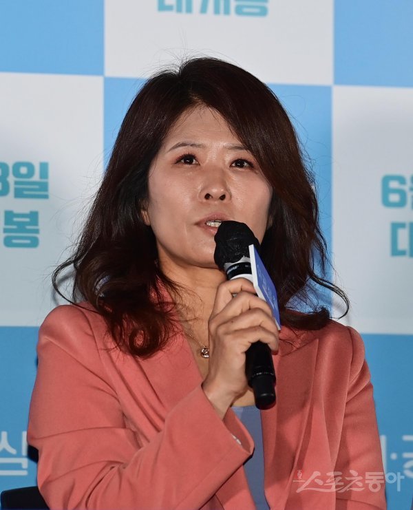 배우 황석정이 26일 서울 용산구 CGV용산아이파크몰점에서 열린 영화 ‘이공삼칠’ 언론시사회에서 인사말을 하고 있다.