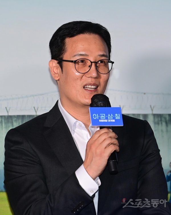 모홍진 감독이 26일 서울 용산구 CGV용산아이파크몰점에서 열린 영화 ‘이공삼칠’ 언론시사회에서 인사말을 하고 있다.