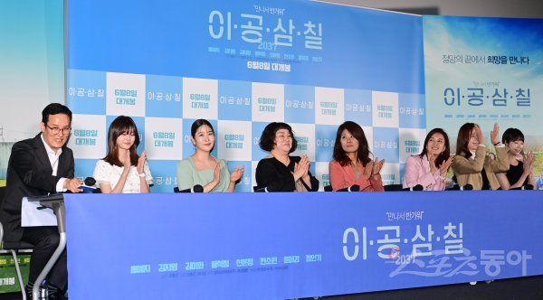 26일 서울 용산구 CGV용산아이파크몰점에서 열린 영화 ‘이공삼칠’ 언론시사회에서 모홍진 감독의 인사말에 배우 홍예지, 김지영, 김미화, 황석정, 신은정, 전소민, 윤미경이 손뼉을 치고 있다.