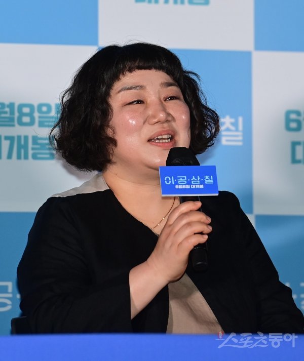 배우 김미화가 26일 서울 용산구 CGV용산아이파크몰점에서 열린 영화 ‘이공삼칠’ 언론시사회에서 인사말을 하고 있다.