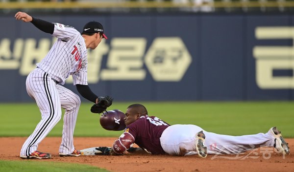 26일 서울 잠실야구장에서 열린 ‘2022 신한은행 SOL KBO리그’ LG 트윈스와 키움 히어로즈의 경기에서 3회초 무사 키움 푸이그가 내야 땅볼을 놓친 LG 2루수의 실책을 틈타 2루로 파고들어 세이프 되고 있다.