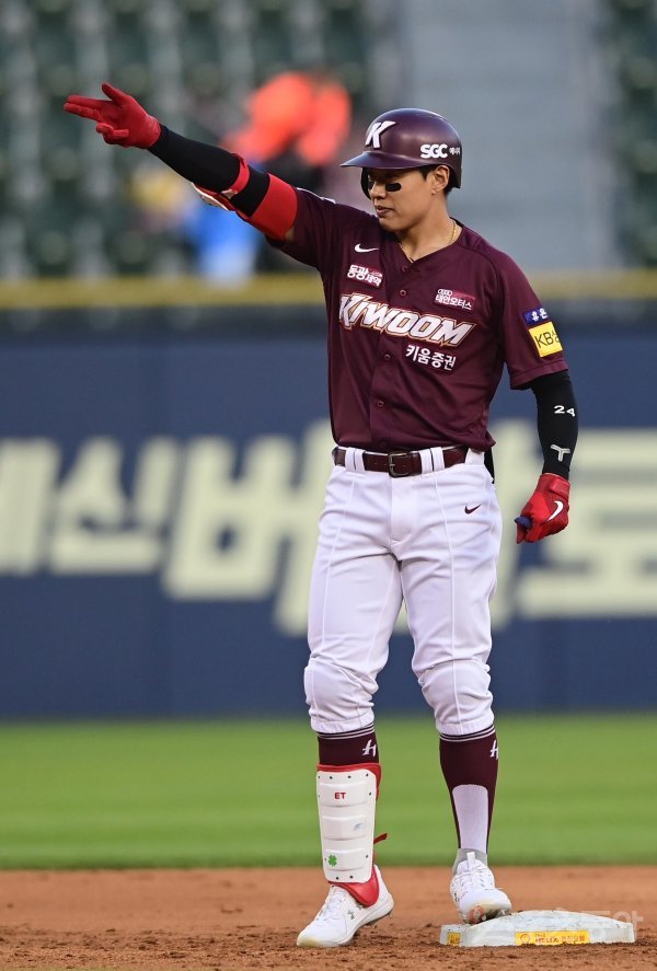 26일 서울 잠실야구장에서 열린 ‘2022 신한은행 SOL KBO리그’ LG 트윈스와 키움 히어로즈의 경기에서 3회초 1사 만루 키움 송성문이 3타점 중전 2루타를 쳐낸 뒤 더그아웃을 향해 세리머니를 하고 있다.