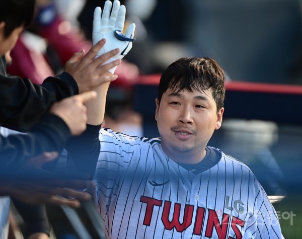 26일 서울 잠실야구장에서 열린 ‘2022 신한은행 SOL KBO리그’ LG 트윈스와 키움 히어로즈의 경기에서 3회말 1사 LG 허도환이 좌월 솔로 홈런을 쳐낸 후 더그아웃에서 동료들의 축하를 받고 있다.