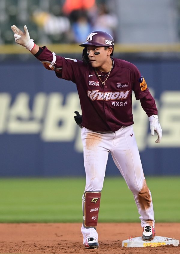 26일 서울 잠실야구장에서 열린 ‘2022 신한은행 SOL KBO리그’ LG 트윈스와 키움 히어로즈의 경기에서 3회초 1사 2루 키움 김태진이 선제 1타점 좌전 2루타를 쳐낸 후 더그아웃을 향해 세리머니를 하고 있다.