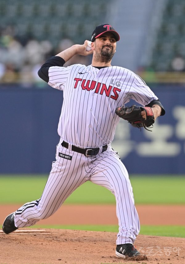 26일 서울 잠실야구장에서 열린 ‘2022 신한은행 SOL KBO리그’ LG 트윈스와 키움 히어로즈의 경기에서 선발 투수로 마운드에 오른 LG 플럿코가 역투하고 있다.