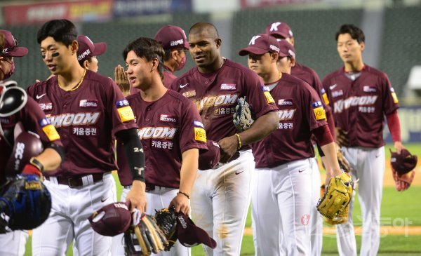 26일 서울 잠실야구장에서 열린 ‘2022 신한은행 SOL KBO리그’ LG 트윈스와 키움 히어로즈의 경기에서 LG에 12-3으로 승리한 키움 선수들이 기쁨을 나누고 있다.