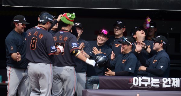 29일 수원KT위즈파크에서 ‘2022 신한은행 MY CAR KBO리그’ 한화 이글스와 KT 위즈 경기가 열렸다. 4회초 1사 1루 한화 김인환이 동점을 만드는 우중월 투런 홈런을 날리고 그라운드를 돌아 홈인해 하이파이브 하고 있다.
