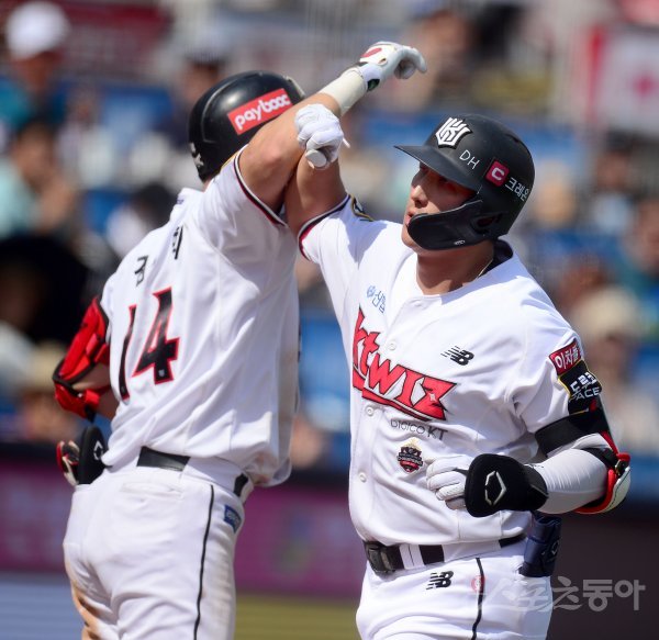 29일 수원KT위즈파크에서 ‘2022 신한은행 MY CAR KBO리그’ 한화 이글스와 KT 위즈 경기가 열렸다. 3회말 2사 1루 KT 황재균이 다시 앞서가는 좌중월 투런 홈런을 날리고 그라운드를 돌아 홈인해 기뻐하고 있다.