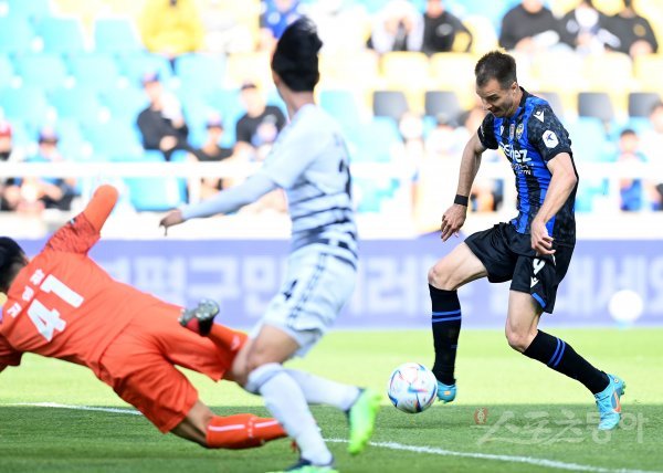 29일 인천 축구전용경기장에서 열린 ‘하나원큐 K리그1 2022’ 인천 유나이티드와 성남 FC의 경기에서 인천 무고사가 슛을 시도하고 있다.