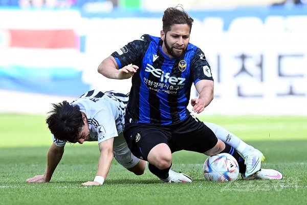 29일 인천 축구전용경기장에서 열린 ‘하나원큐 K리그1 2022’ 인천 유나이티드와 성남 FC의 경기에서 인천 아길라르가 성남 선수의 반칙에 넘어지고 있다.