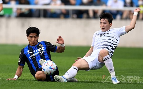 29일 인천 축구전용경기장에서 열린 ‘하나원큐 K리그1 2022’ 인천 유나이티드와 성남 FC의 경기에서 양 팀 선수들이 볼 경합을 벌이고 있다.