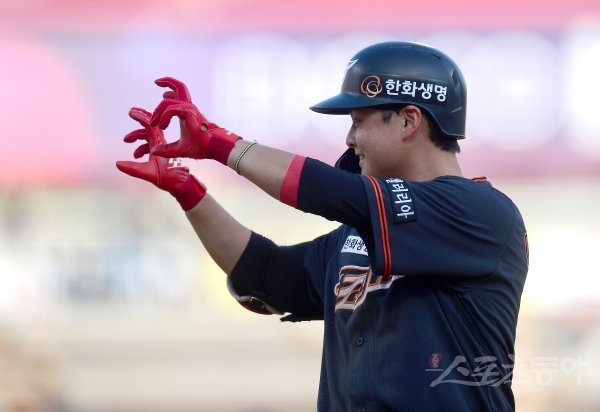 29일 수원KT위즈파크에서 ‘2022 신한은행 MY CAR KBO리그’ 한화 이글스와 KT 위즈 경기가 열렸다. 9회초 1사 1,2루 한화 이도윤이 1타점 적시타를 치고 1루에서 기뻐하고 있다.