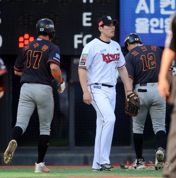 29일 수원KT위즈파크에서 ‘2022 신한은행 MY CAR KBO리그’ 한화 이글스와 KT 위즈 경기가 열렸다. KT 김재윤이 9회초 1사 만루 상황에서 역전타를 허용한 후 아쉬워하고 있다.