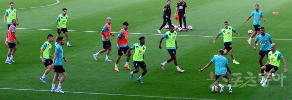 브라질 축구대표팀이 29일 경기도 고양종합운동장에서 다음 달 2일 한국과 평가전을 위해 패스 훈련을 하고 있다.