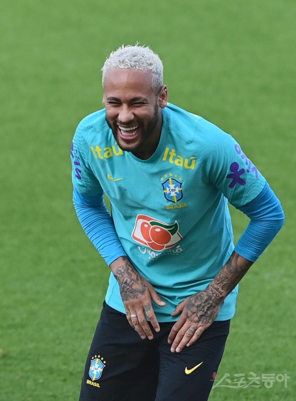 브라질 축구대표팀이 29일 경기도 고양종합운동장에서 다음 달 2일 한국과 평가전을 위해 훈련을 하고 있다. 네이마르가 훈련 중 웃고 있다.