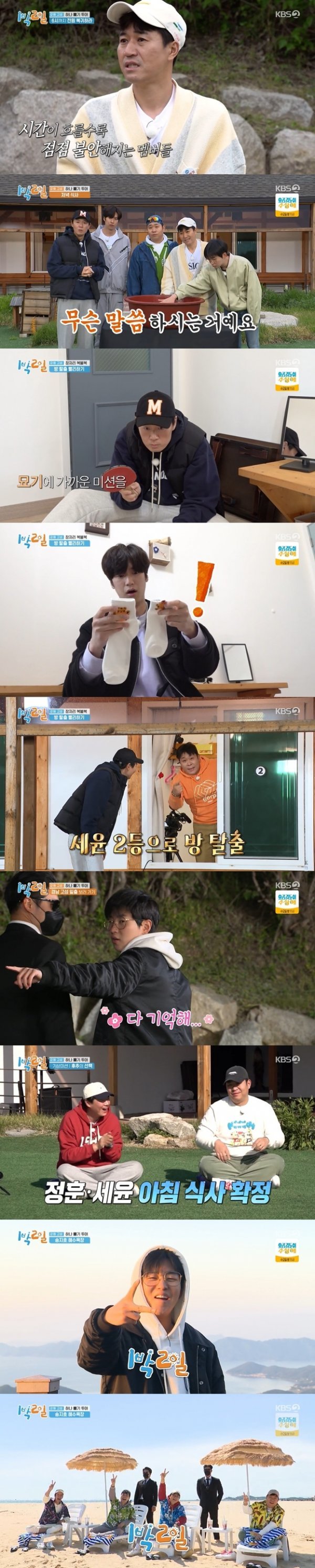 역대급 벌칙 공지로 아수라장이 된 가운데, 잠자리 복불복으로는 방 탈출 게임이 진행됐다. 5개 방에서 각기 다른 미션을 수행해야 하는 상황에서 휴지심에 탁구공을 넣은 연정훈과 도미노 200개를 세운 문세윤이 먼저 성공하면서 실내 취침의 기회를 획득했다.