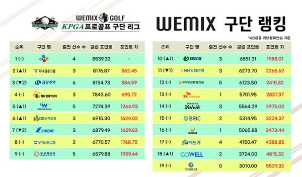 CJ가 ‘위믹스 구단 랭킹’ 1위 자리를 지키며 ‘위믹스 2022 KPGA 프로골프 구단 리그’ 독주 체제를 구축했다.