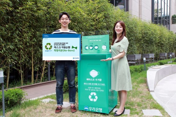 마스크 필터 제조사와 협업해 사용 후 버려지는 폐마스크를 수거해 자원순환용품을 제작한다. 캠페인 참여를 독려하기 위해 본점과 우리금융상암센터 등 주요 영업점에 마스크 수거함을 설치했다.
