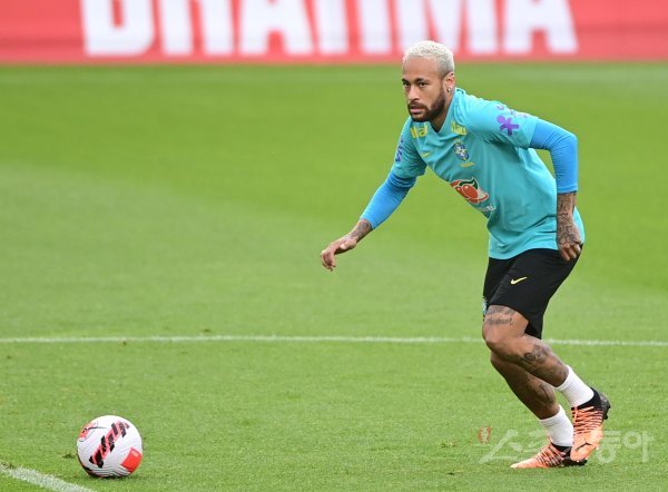 브라질 축구대표팀 네이마르가 30일 경기도 고양종합운동장에서 다음 달 2일 한국과 평가전 대비 훈련에서 패스할 동료를 바라보고 있다.