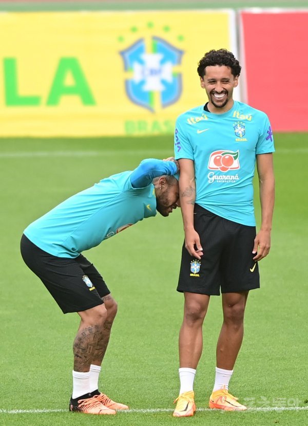 브라질 축구대표팀 네이마르가 30일 경기도 고양종합운동장에서 다음 달 2일 한국과 평가전 대비 훈련에서 마르퀴뇨스와 장난을 치고 있다.
